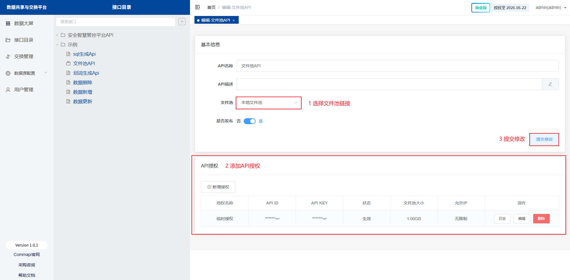 发布API后点击API名称查看文件API文档,使用其中的链接即可完成对文件池文件上传下载和删除的操作