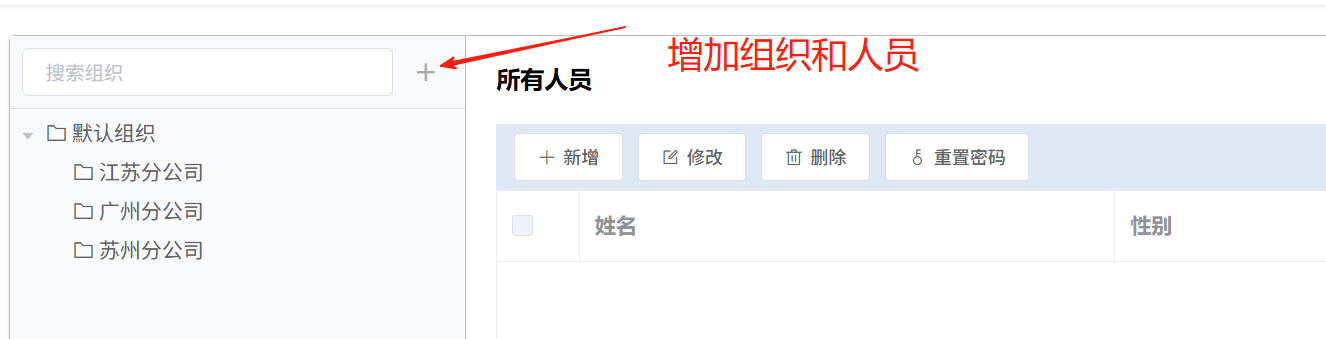 点击左上角+按钮,支持添加组织(手动页面方式),导入组织,导入人员,如下所示: